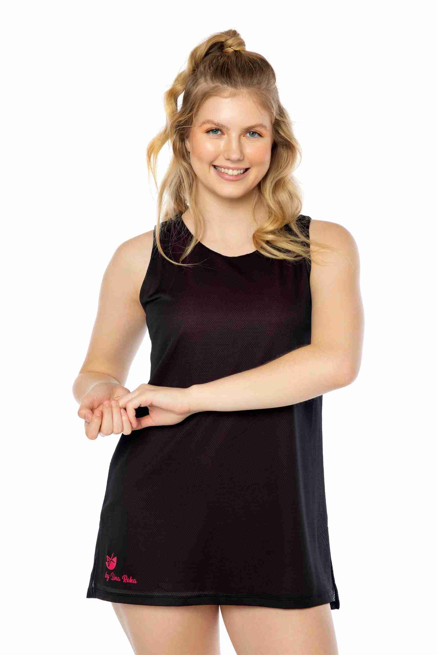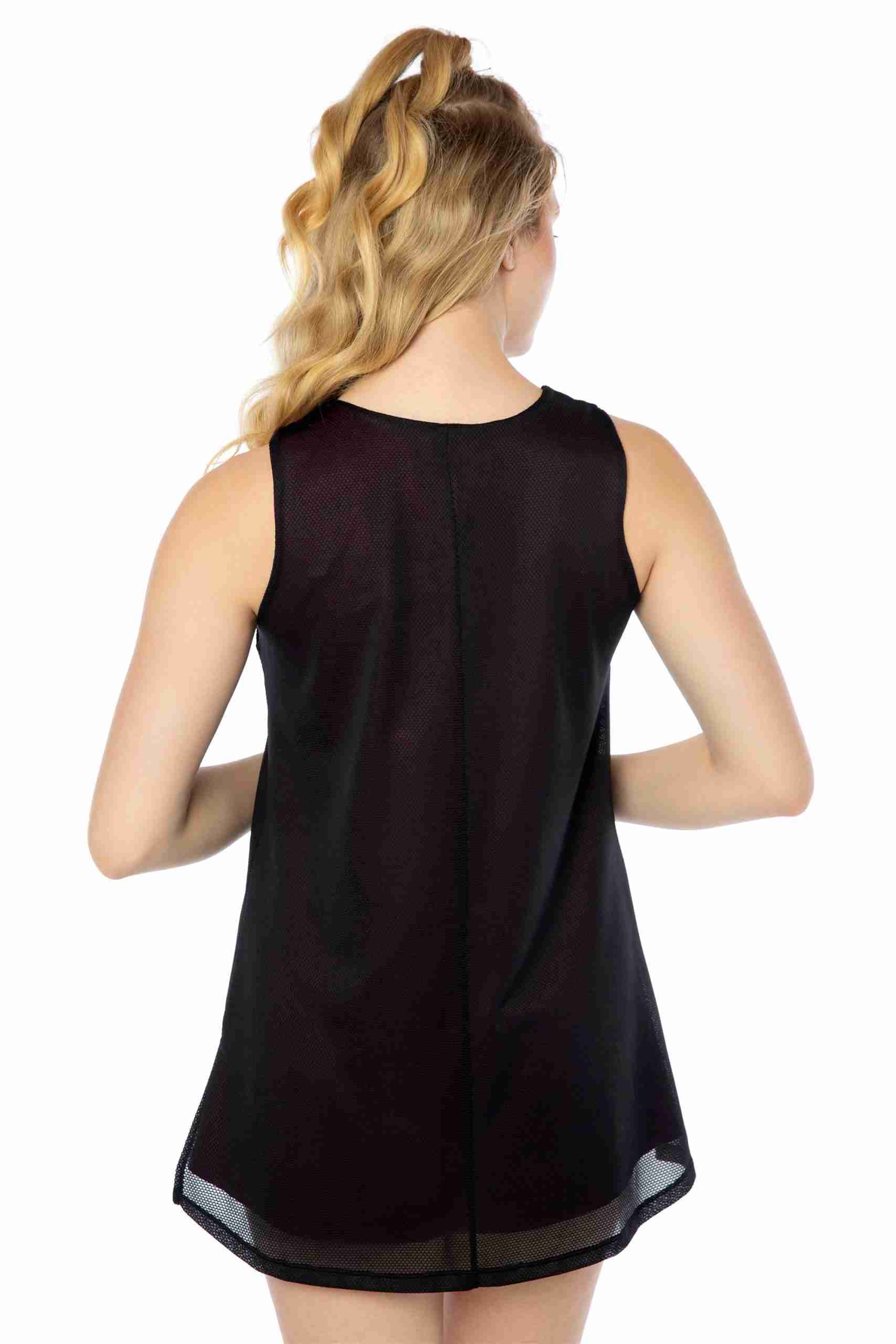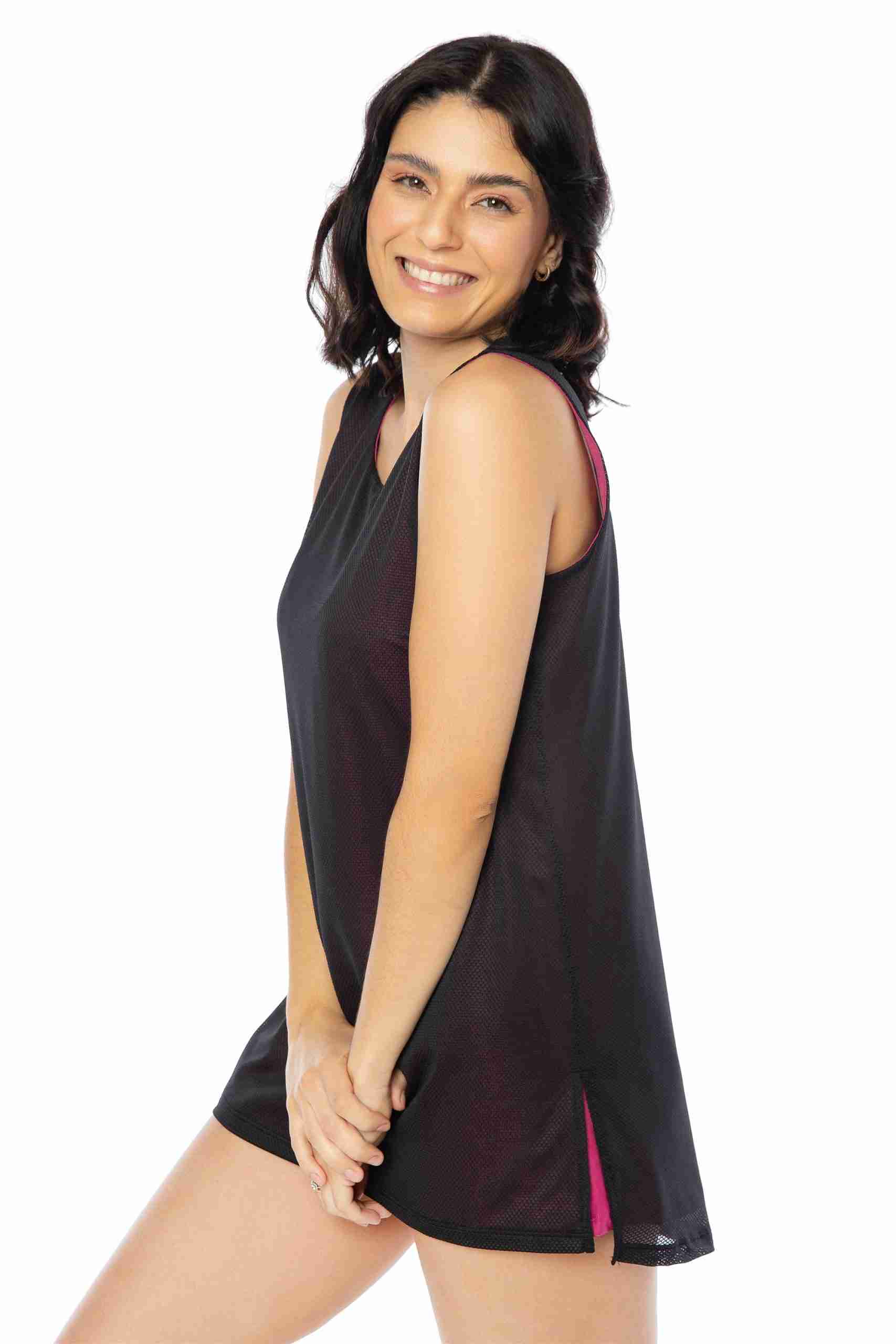 VESTIDO DEPORTIVO PARA MUJER: Nuestro vestido deportivo de dos capas para mujer cuenta con una tela transparente en color negro que resalta el morado de la capa inferior. Este versátil vestido puede ser usado como tal o como top, perfecto para combinar con shorts.