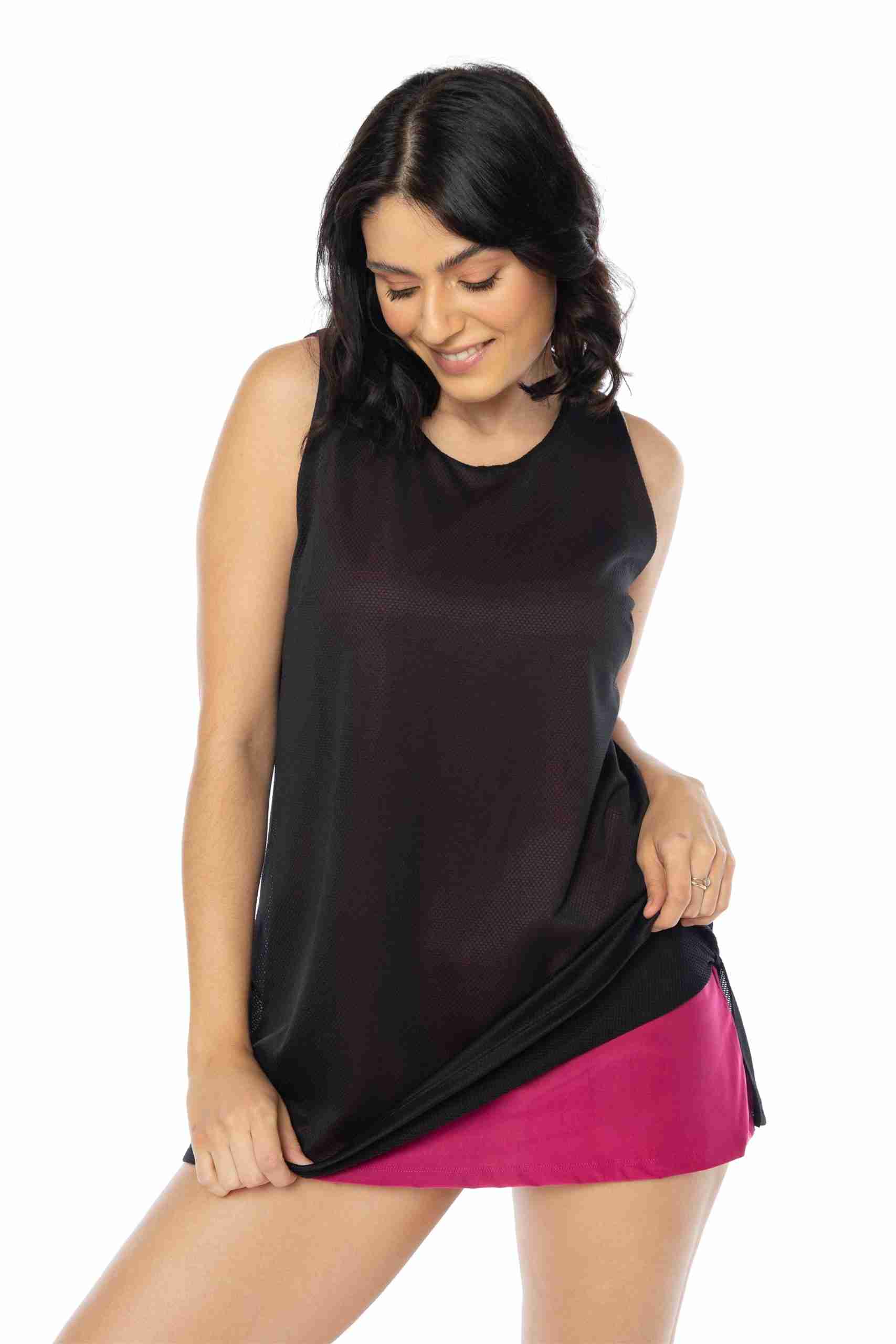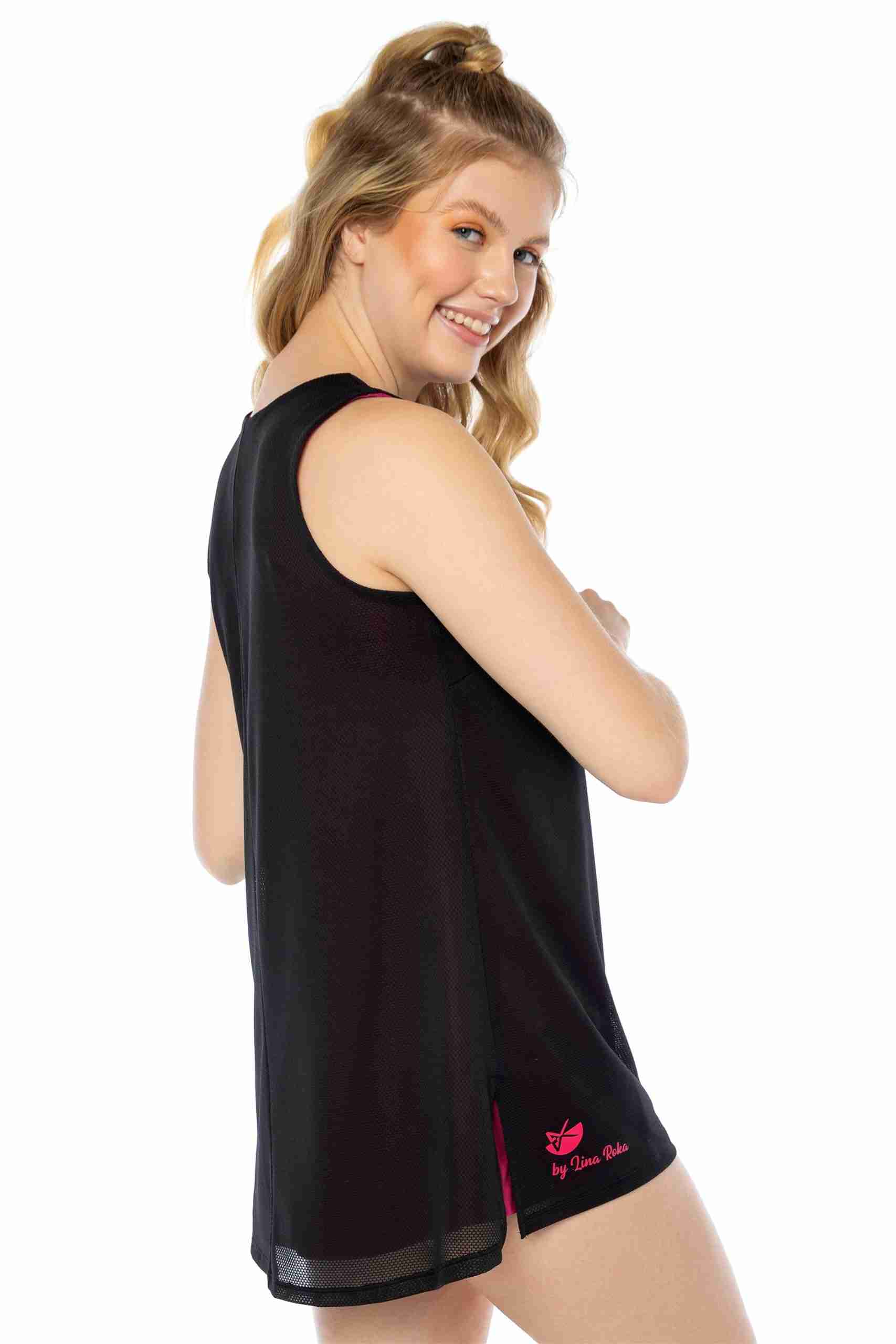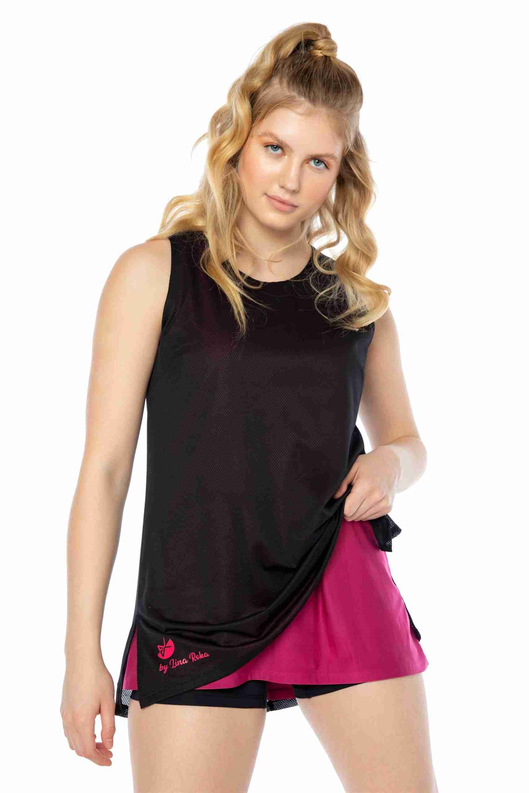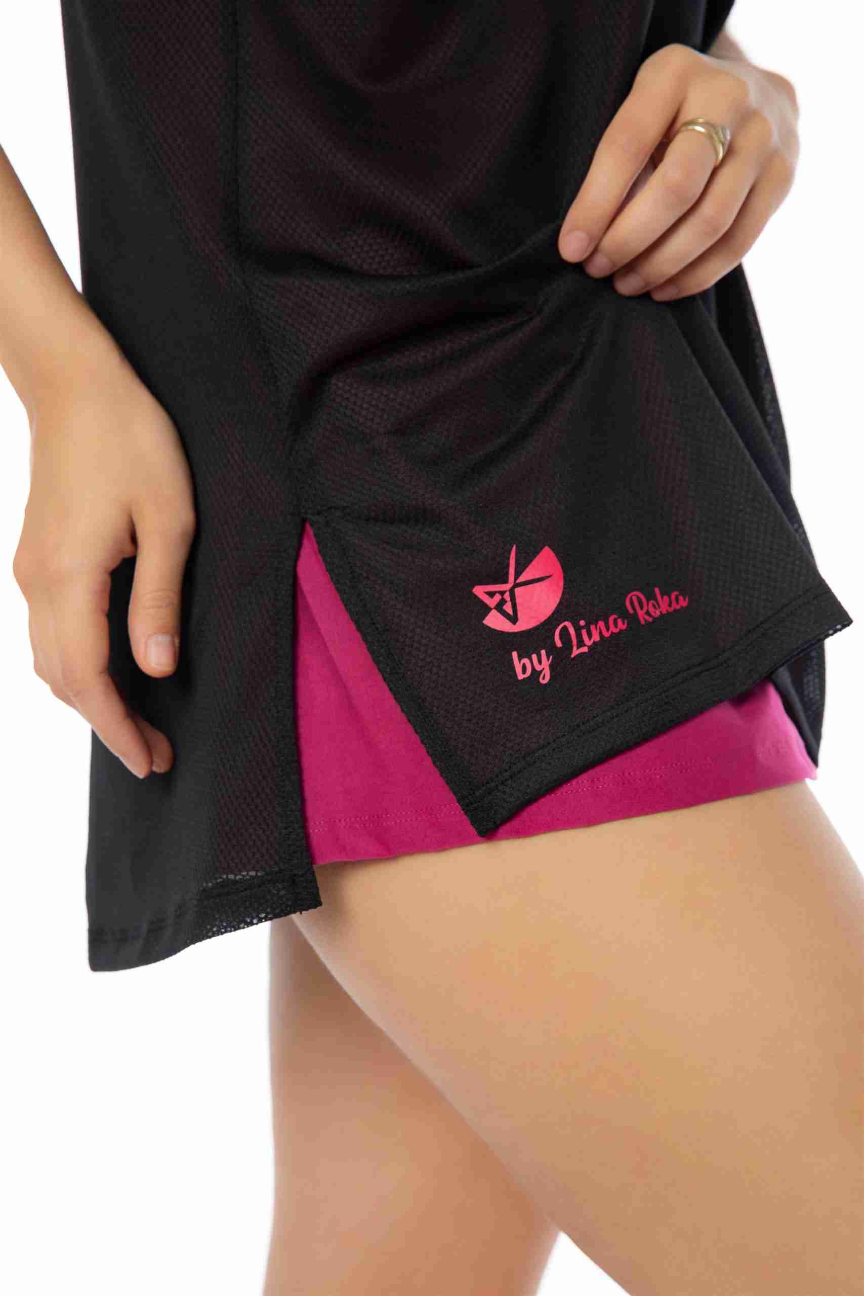 VESTIDO DEPORTIVO PARA MUJER: Nuestro vestido deportivo de dos capas para mujer cuenta con una tela transparente en color negro que resalta el morado de la capa inferior. Este versátil vestido puede ser usado como tal o como top, perfecto para combinar con shorts.