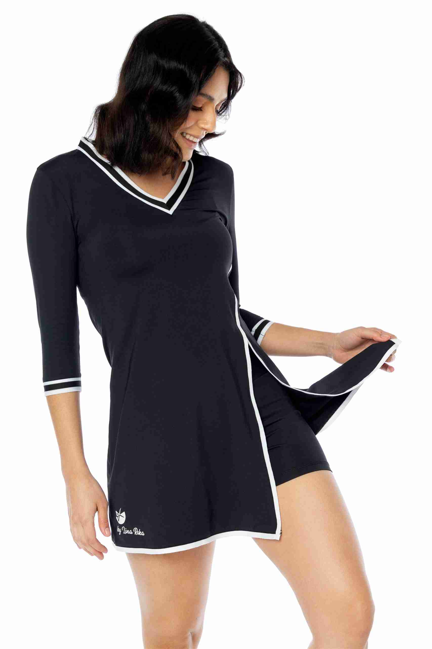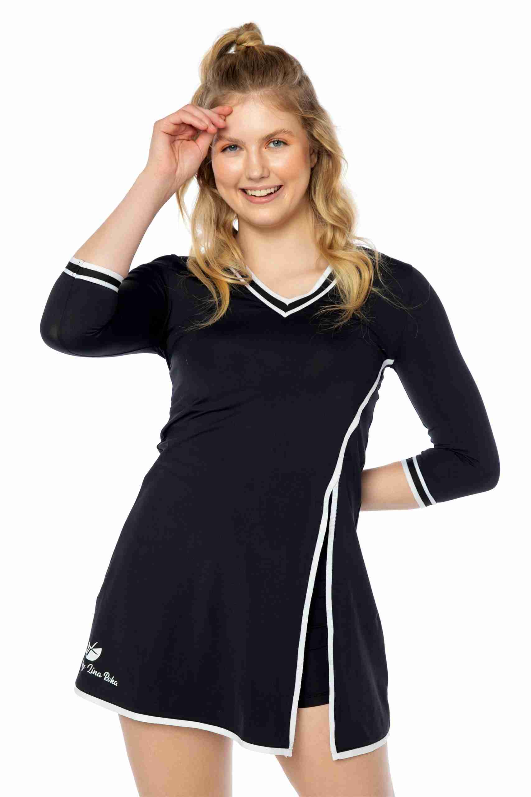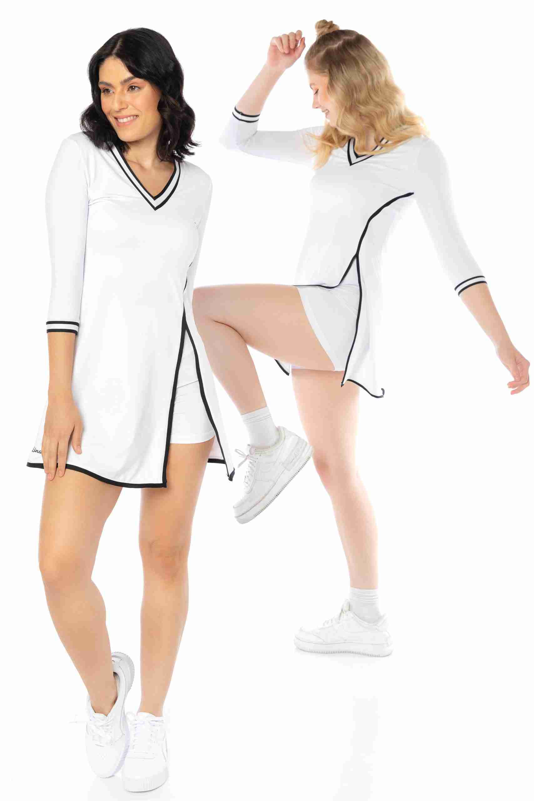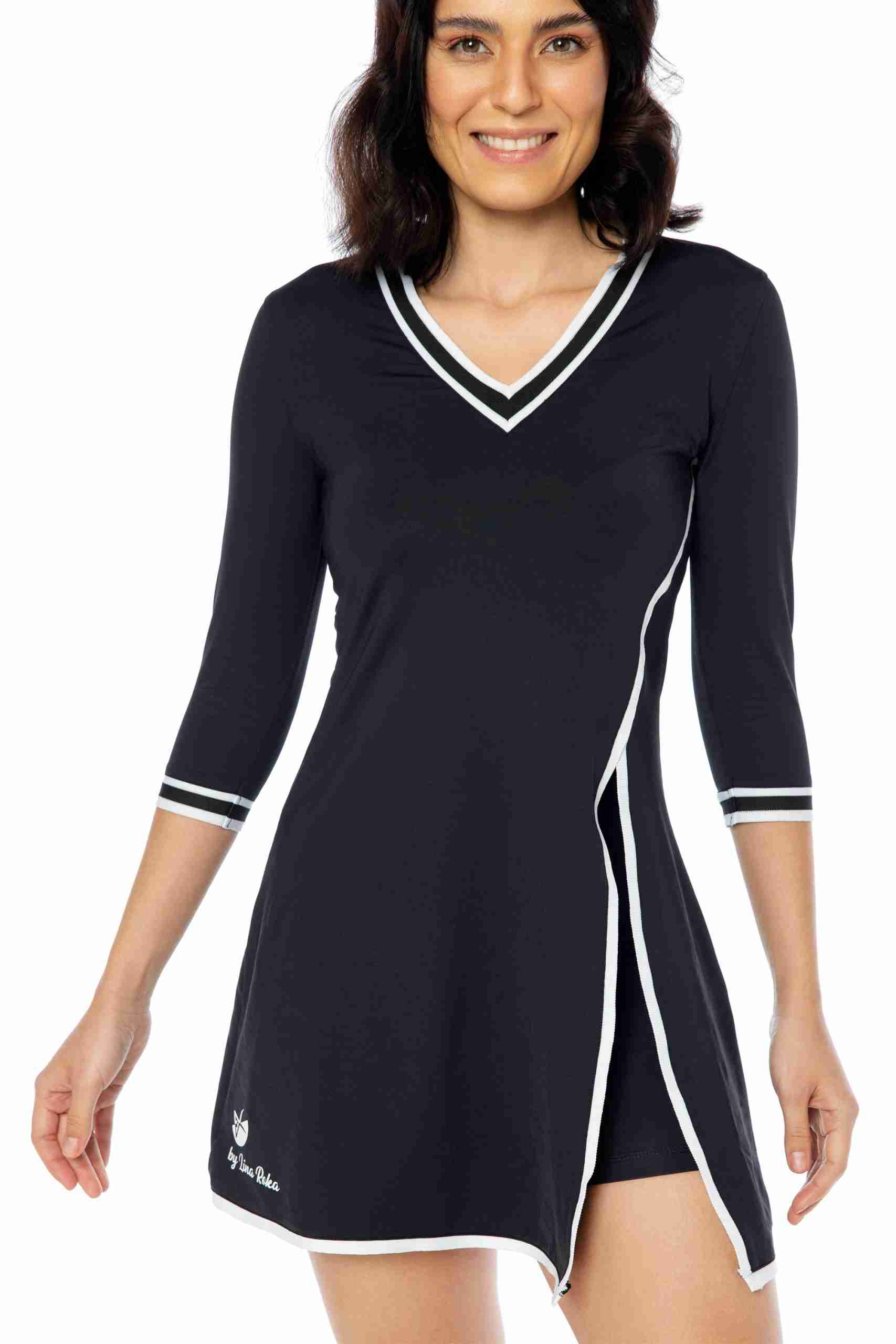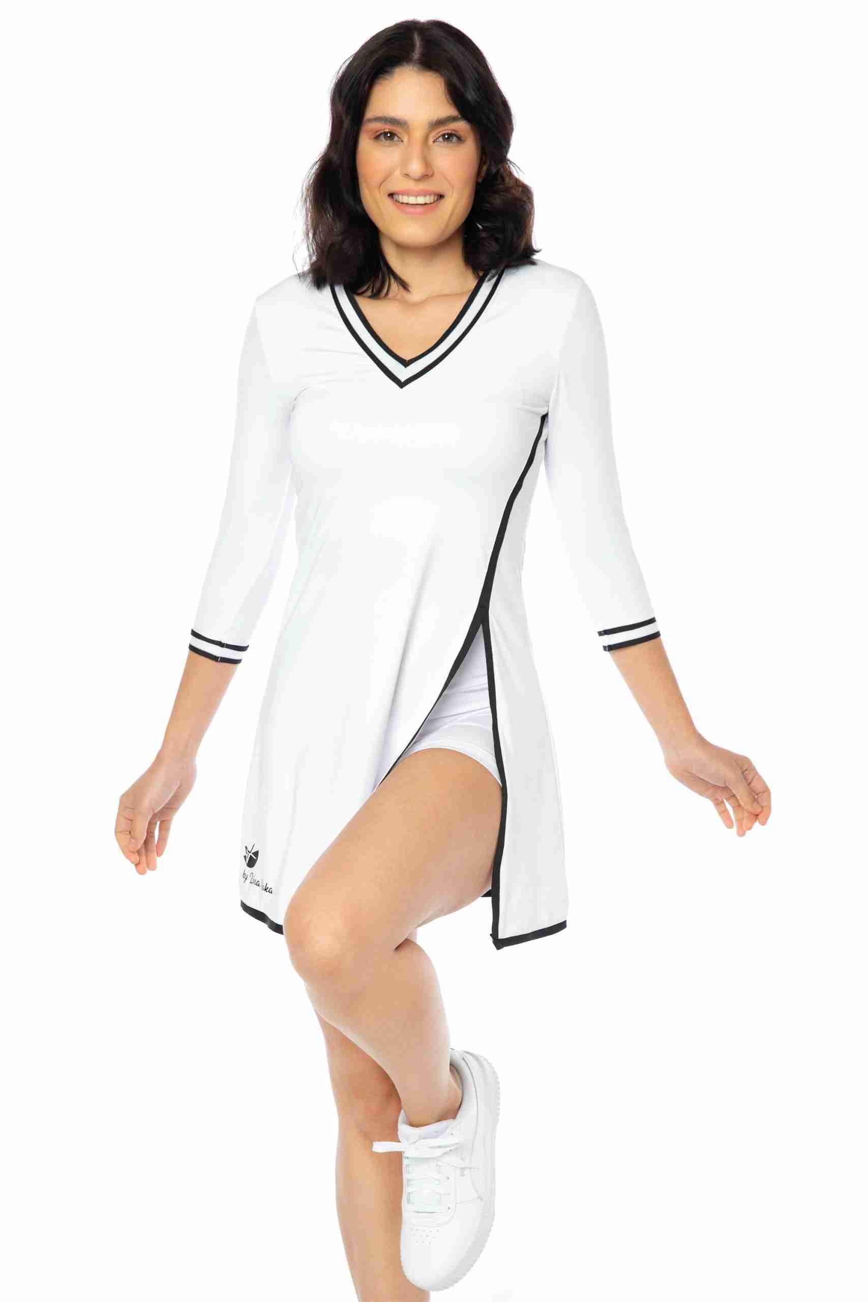 Vestido deportivo para mujer: Nuestro vestido tenis para mujer tiene mangas de tres cuartos y un pantalón corto con bolsillo trasero, perfecto para guardar pelotas o el móvil. Su diseño sofisticado agregará elegancia a tu look deportivo. Tejido cómodo: Fabricado en un 86% de poliamida y 14% de elastano, este vestido se adapta a tu cuerpo y te permite moverte con total libertad. Las costuras suaves evitan rozaduras durante la práctica deportiva. ¡Adiós al sudor!: El tejido transpirable permite la ventilación y evaporación del sudor, manteniéndote fresca por más tiempo y evitando olores desagradables. Practica tus deportes favoritos: Este vestido y short deportivo de mujer son ideales para actividades como tenis, pádel, golf e incluso meditación y yoga. Su diseño y material los convierten en tus aliados perfectos. By Lina Roka: Nuestra marca se destaca por ofrecer ropa deportiva femenina que combina estilo y comodidad. Practica tus deportes favoritos con prendas que te hacen sentir bien y con ese toque de estilo que te encanta.