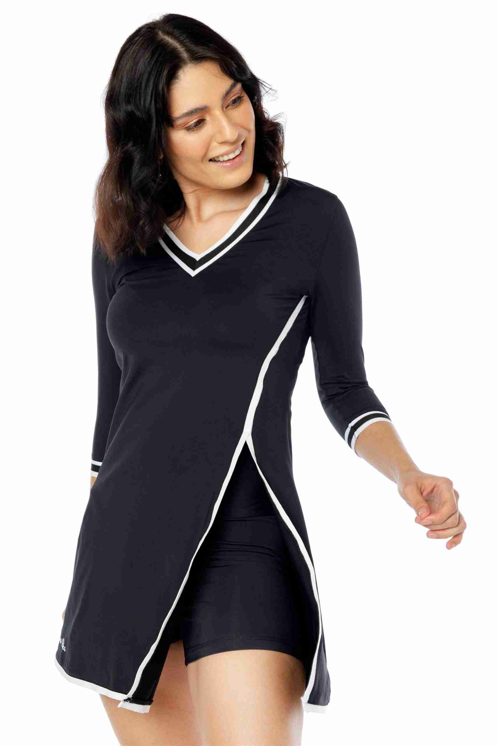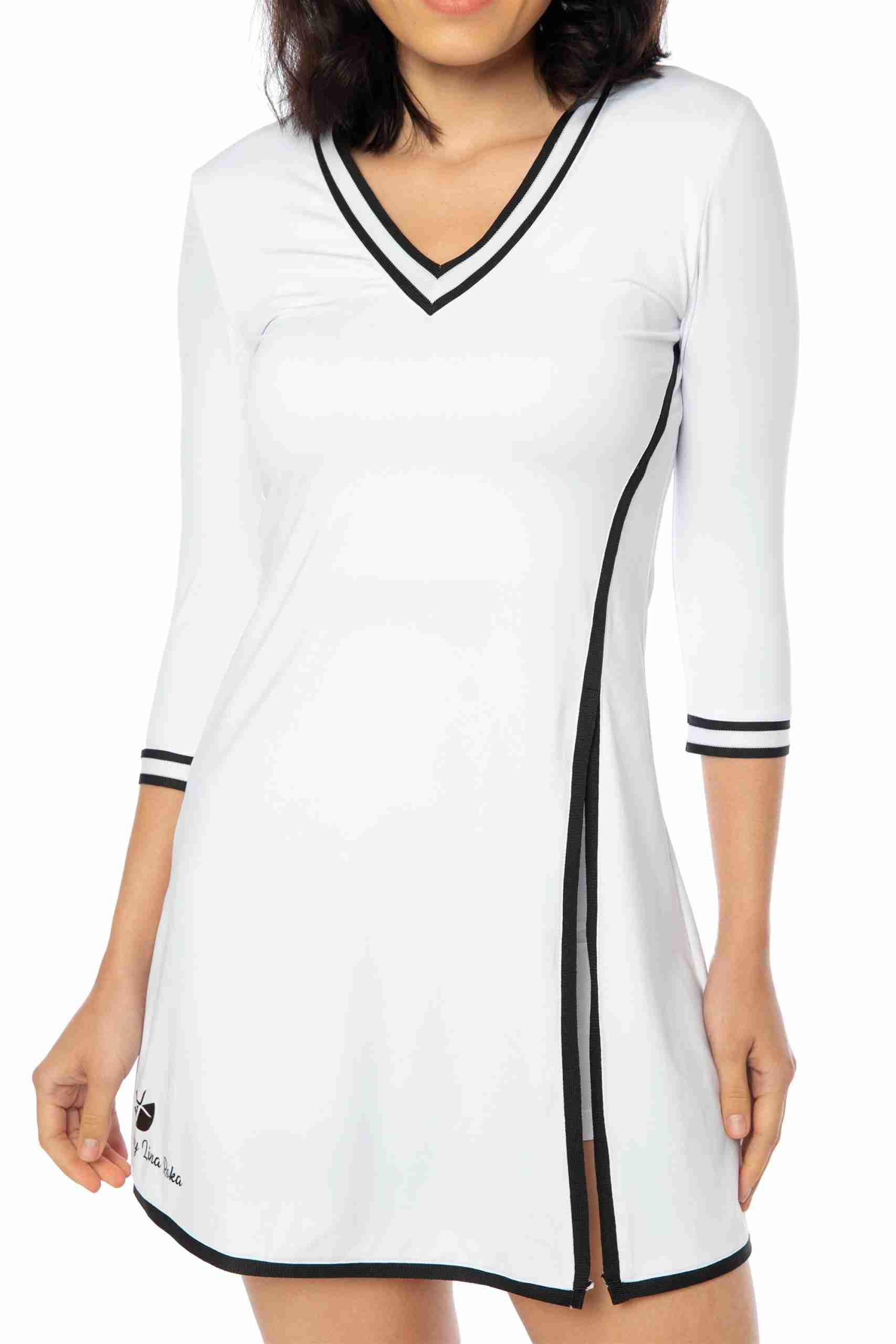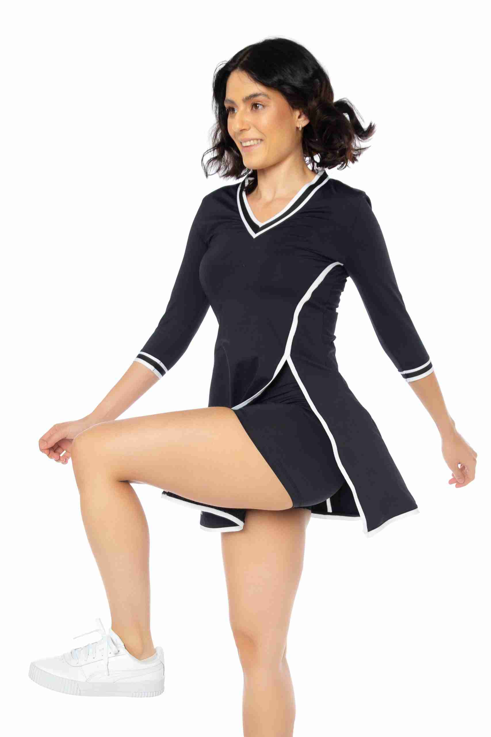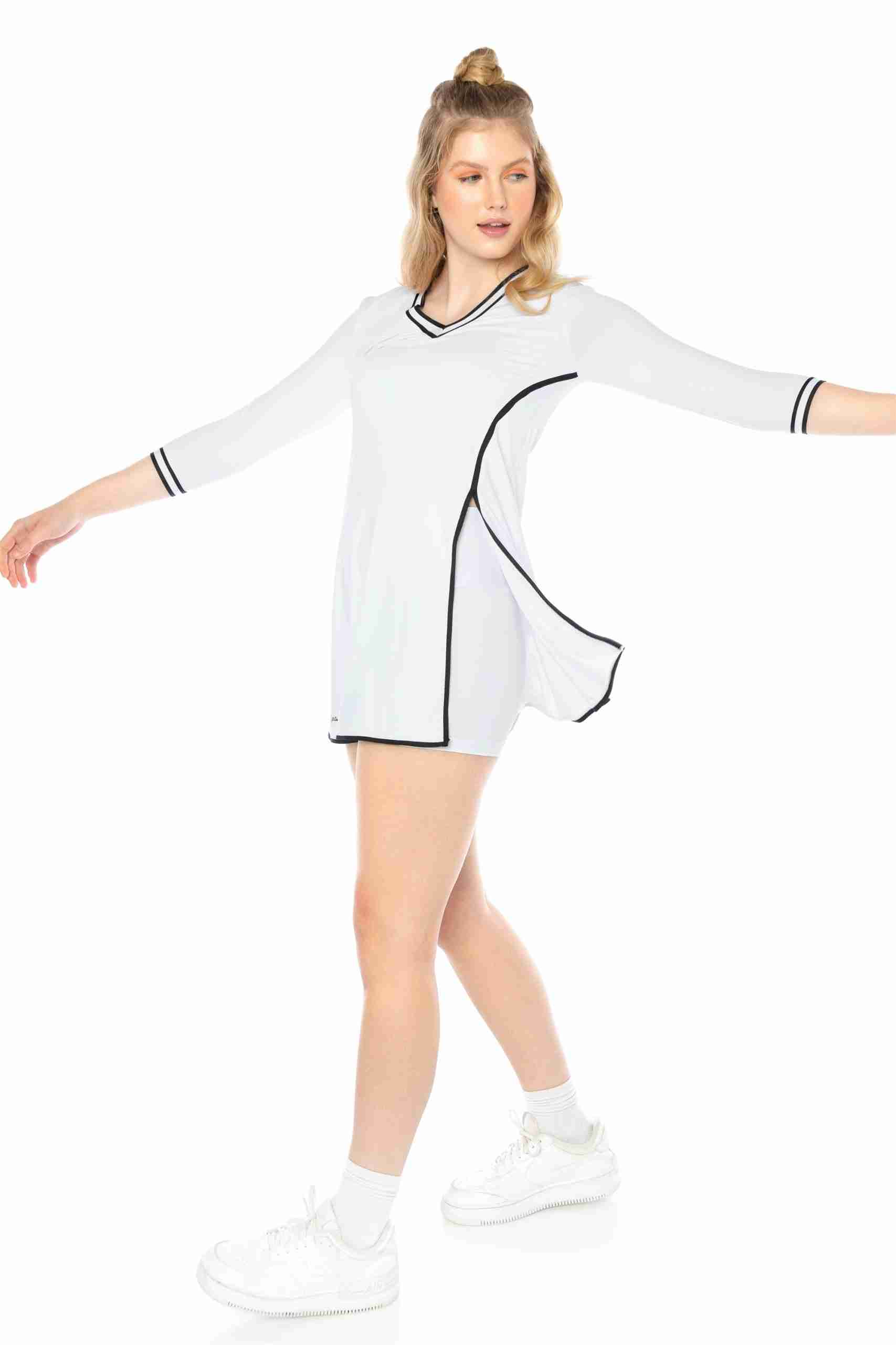 Vestido deportivo para mujer: Nuestro vestido tenis para mujer tiene mangas de tres cuartos y un pantalón corto con bolsillo trasero, perfecto para guardar pelotas o el móvil. Su diseño sofisticado agregará elegancia a tu look deportivo. Tejido cómodo: Fabricado en un 86% de poliamida y 14% de elastano, este vestido se adapta a tu cuerpo y te permite moverte con total libertad. Las costuras suaves evitan rozaduras durante la práctica deportiva. ¡Adiós al sudor!: El tejido transpirable permite la ventilación y evaporación del sudor, manteniéndote fresca por más tiempo y evitando olores desagradables. Practica tus deportes favoritos: Este vestido y short deportivo de mujer son ideales para actividades como tenis, pádel, golf e incluso meditación y yoga. Su diseño y material los convierten en tus aliados perfectos. By Lina Roka: Nuestra marca se destaca por ofrecer ropa deportiva femenina que combina estilo y comodidad. Practica tus deportes favoritos con prendas que te hacen sentir bien y con ese toque de estilo que te encanta.